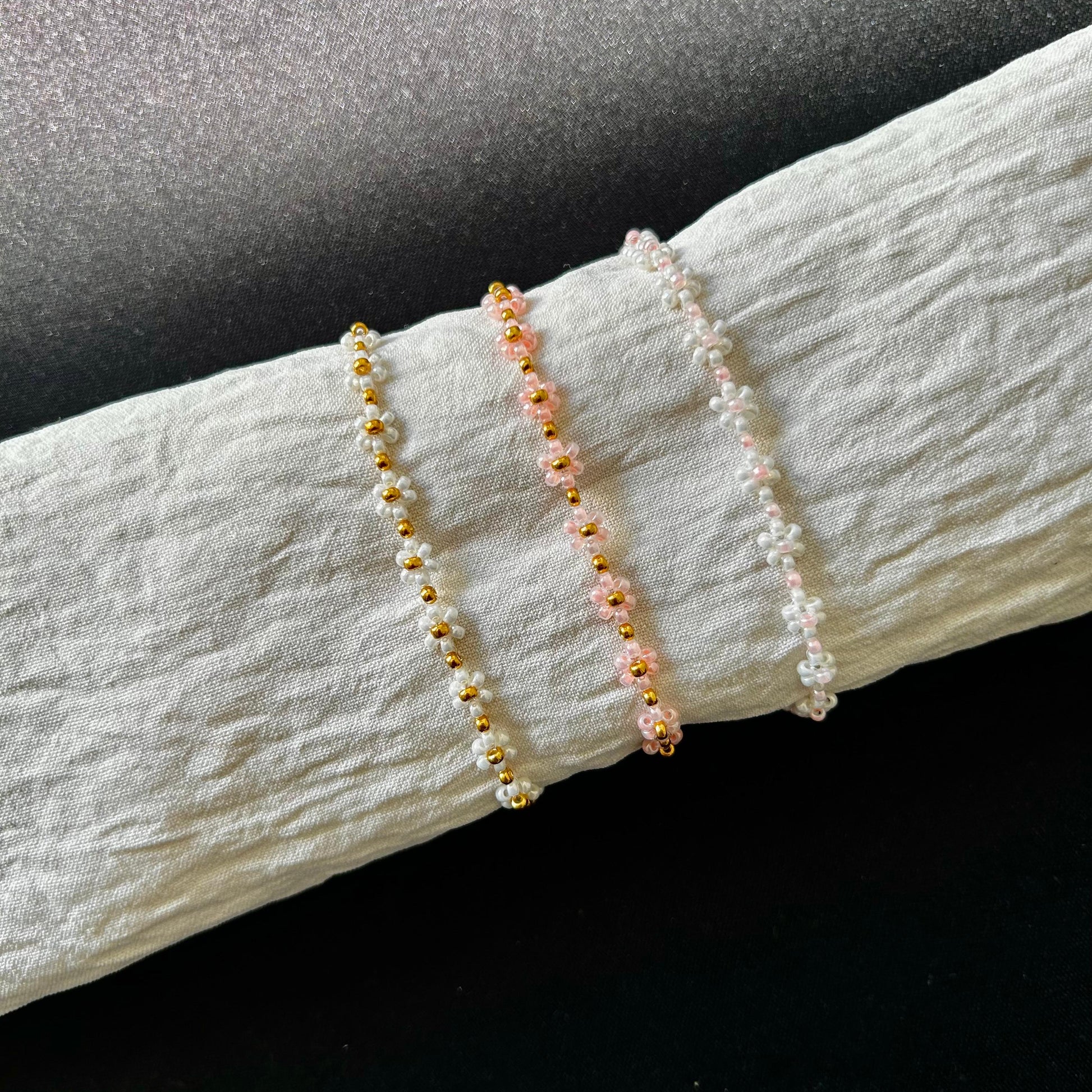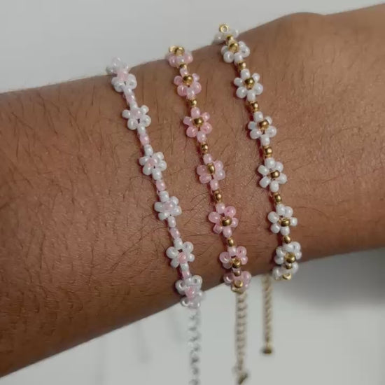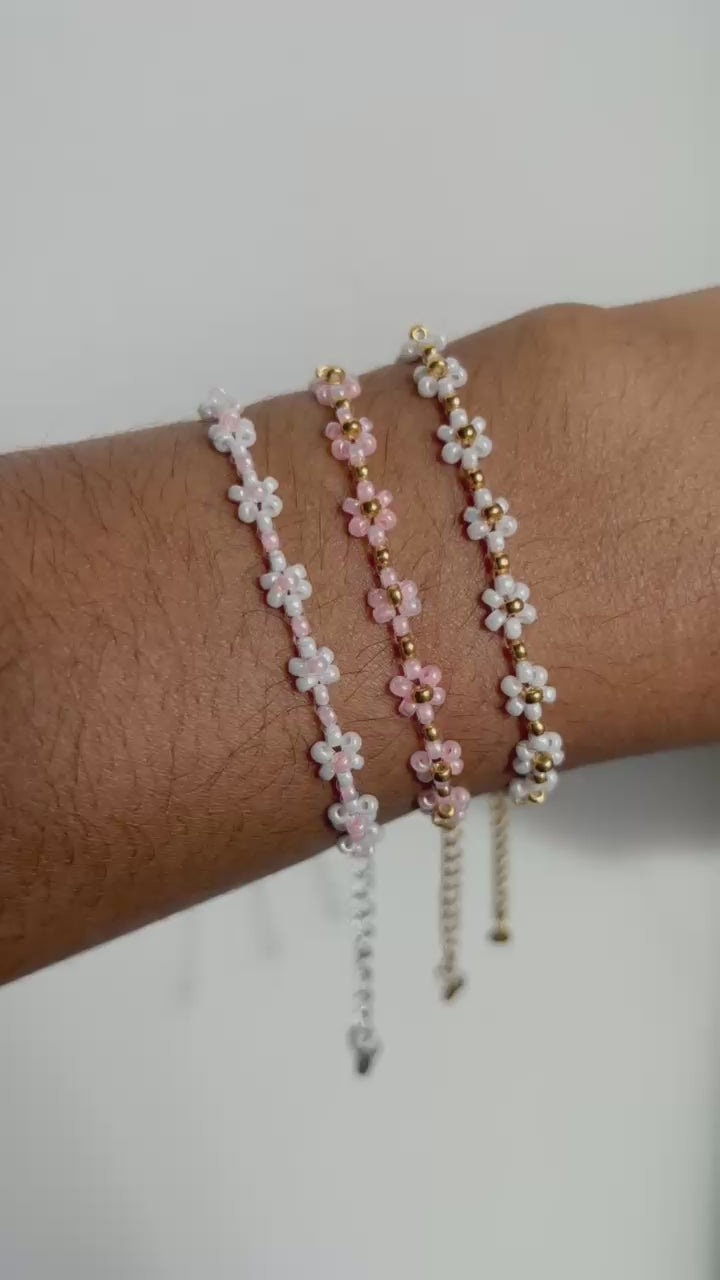 Bracelet de perles avec fermoir et chainette d’extension en acier inoxydable.