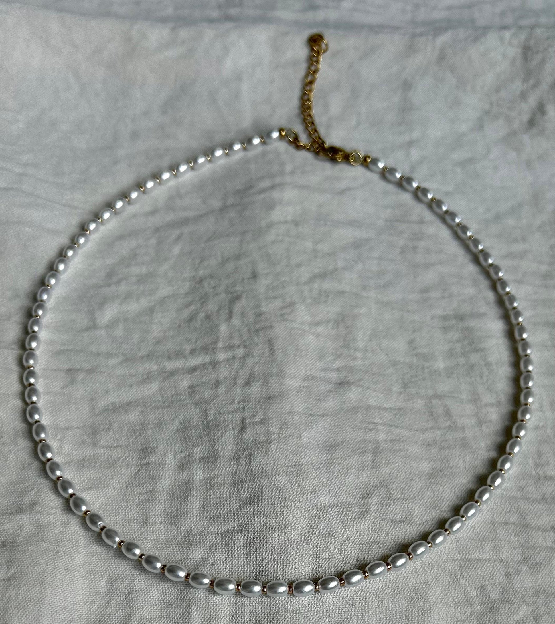 Collier de perles avec fermoir et chainette d’extension en acier inoxydable.